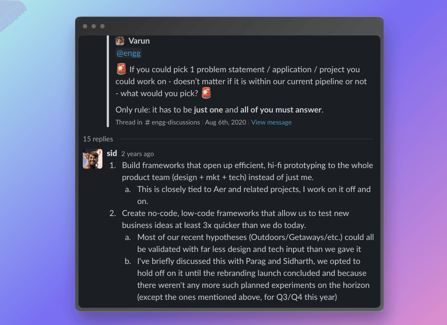 For a certain kind of experiments/features this is the way to go. The speed keeps us on our toes, learning and innovating. No long PRDs, no long-term scopes, no contribution to debt in our codebases, no disrupting our product's roadmap to try a small, yet-to-be-validated idea — just build, ship, learn and repeat.